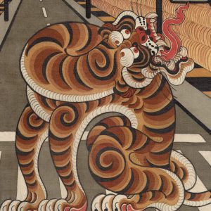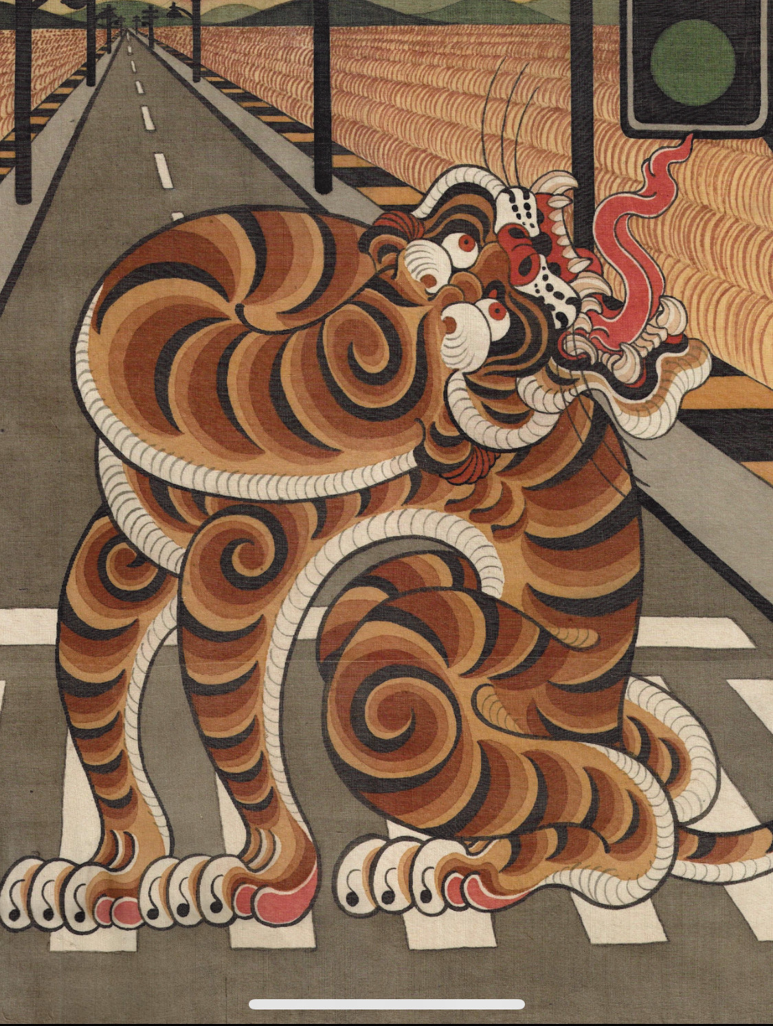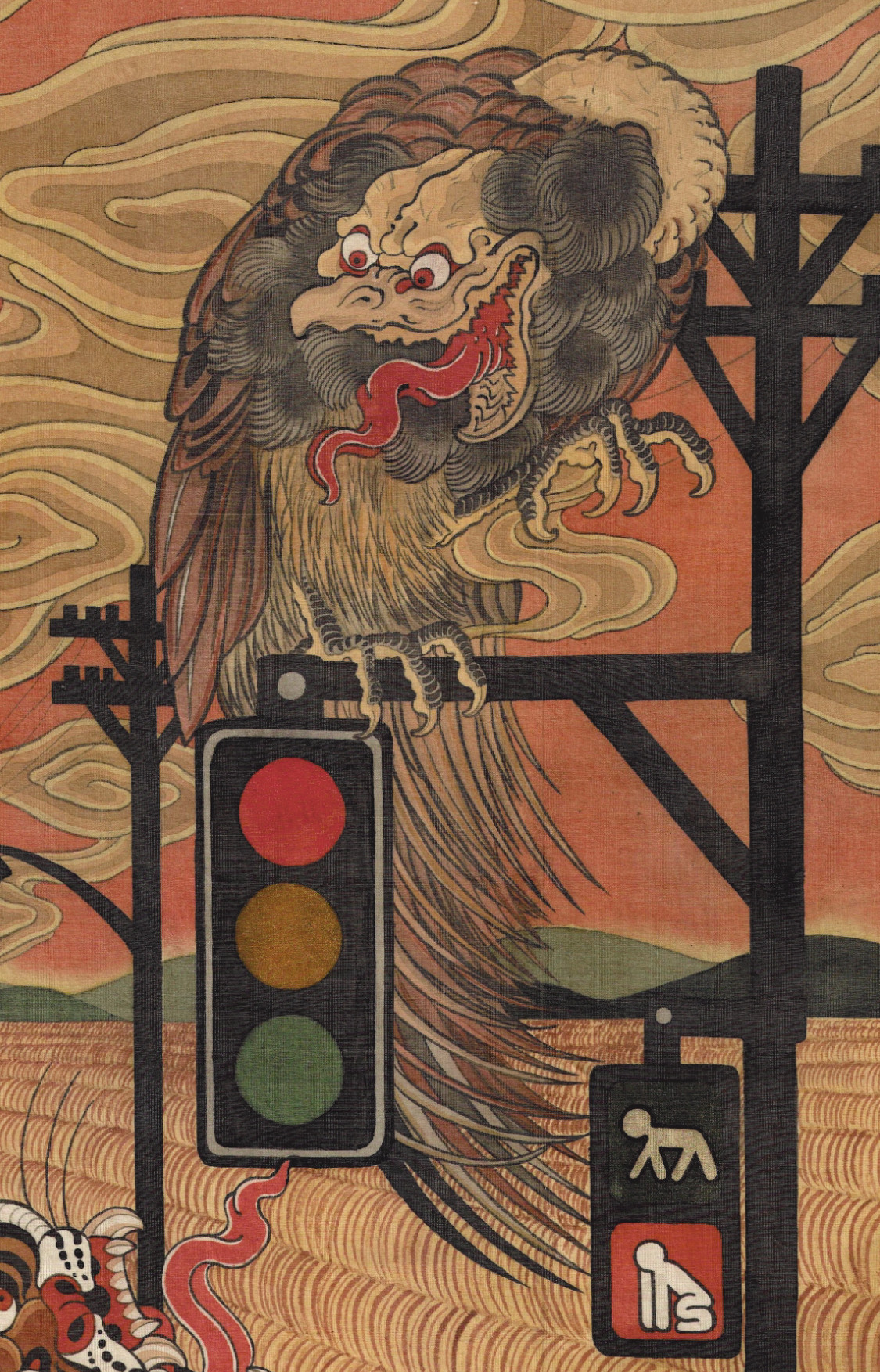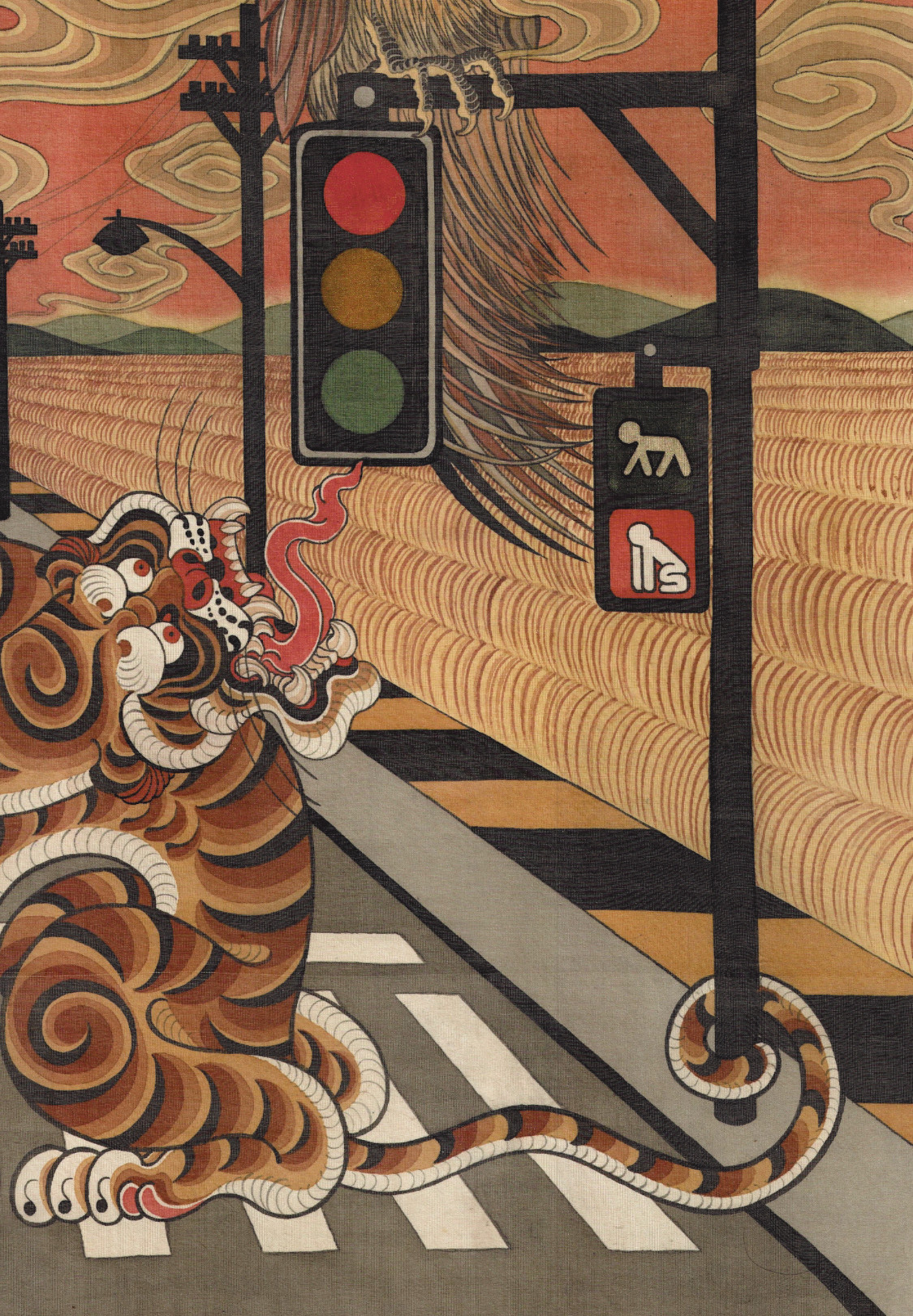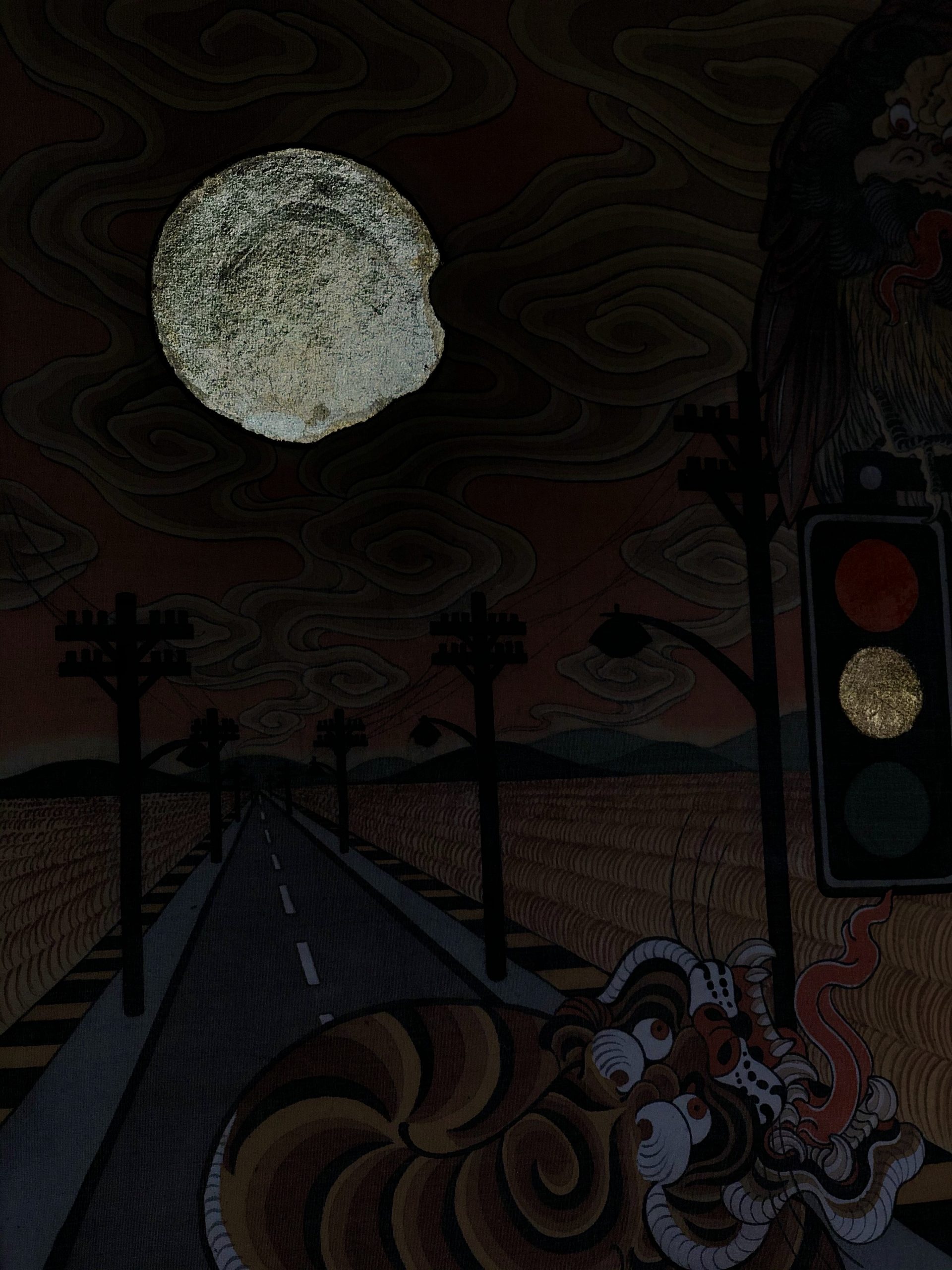 Some details such as traffic light poles are glued in gold underneath the silk to reduce the contrast compared to the sun. However, it gives the effect of traffic lights when turned on.